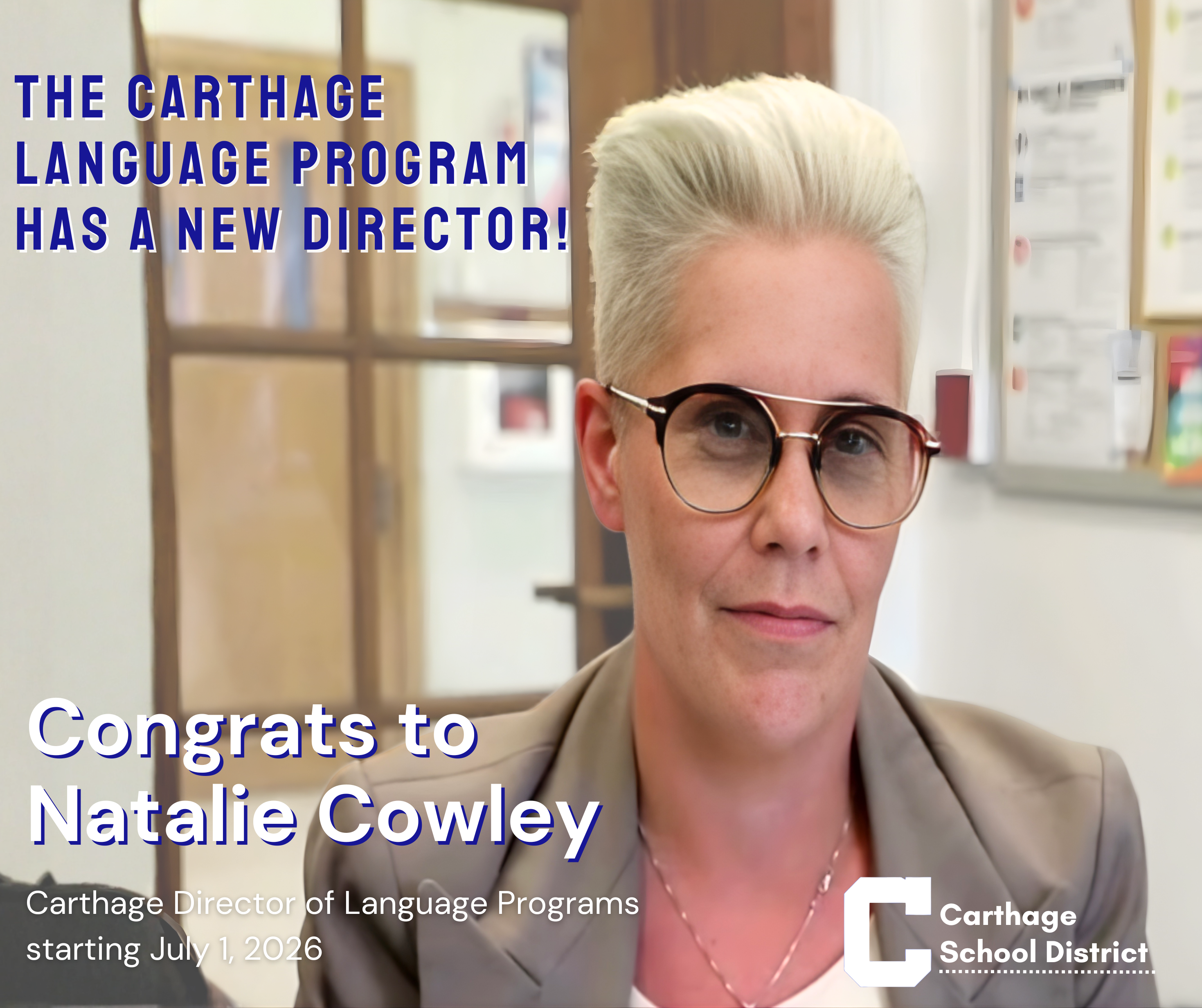 Carthage R-9 Board of Education Appoints Natalie Cowley as Director of Language ProgramsCARTHAGE, MO – The Carthage R‑9 Board of Education is pleased to announce that Natalie Cowley has been select...