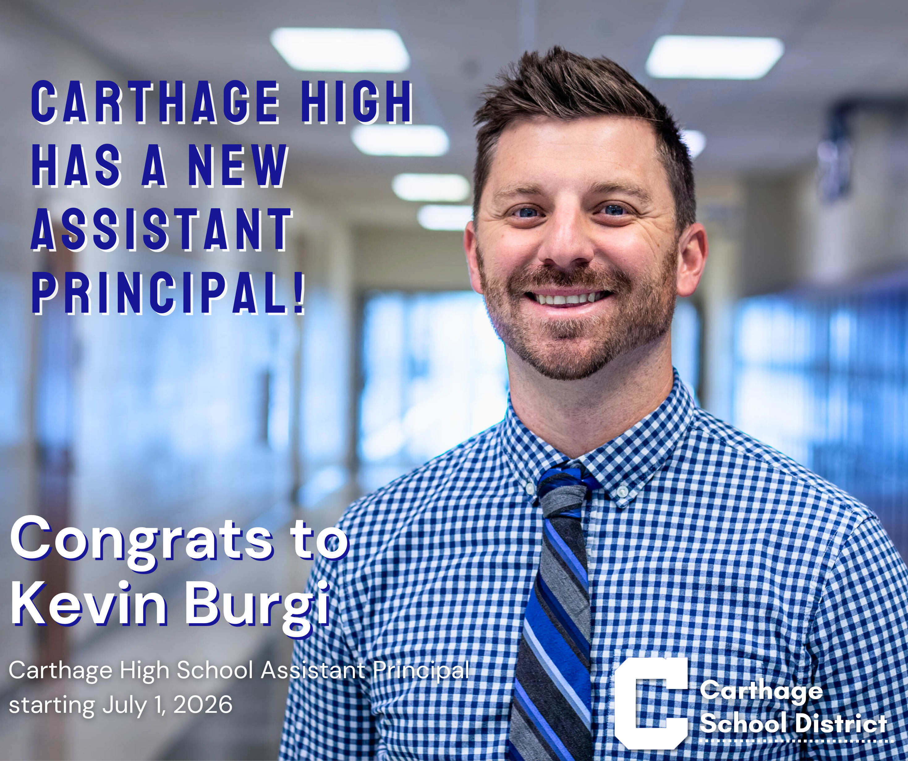 Carthage High School is proud to announce that Mr. Kevin Burgi has been selected as the school’s new Assistant Principal, effective July 1, 2026. Mr. Burgi brings a strong background in both classroom instruction and school leadership, along with a proven commitment to student success.